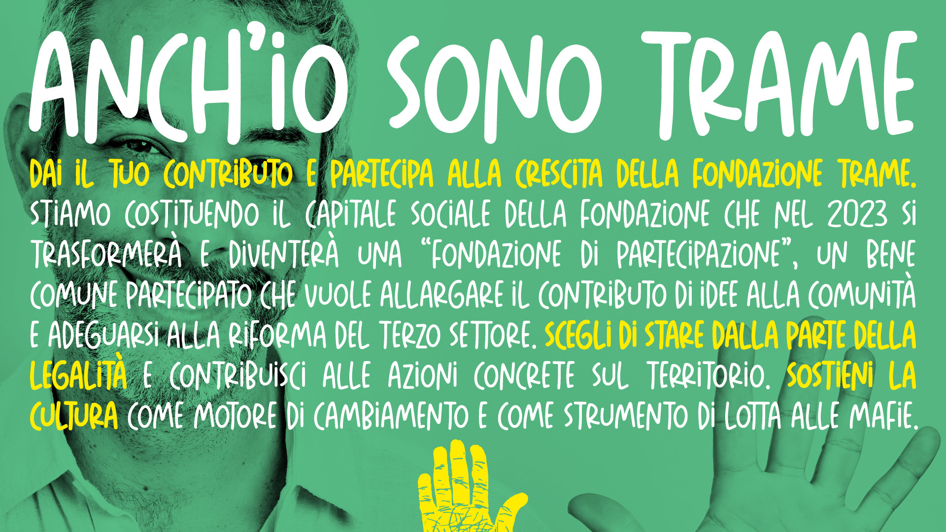 Ecco perché vi chiediamo di partecipare nelle prossime settimane alla raccolta straordinaria delle risorse necessarie alla costituzione del fondo patrimoniale della fondazione ed alla sua trasformazione diventandone parte attiva, e partecipando alle sue attività offrendo il vostro contributo di idee e di proposte, per costruire insieme una fase nuova e ancora più ricca di eventi, iniziative e progetti e per fare della Fondazione Trame un soggetto forte della sua autonomia e della sua indipendenza.