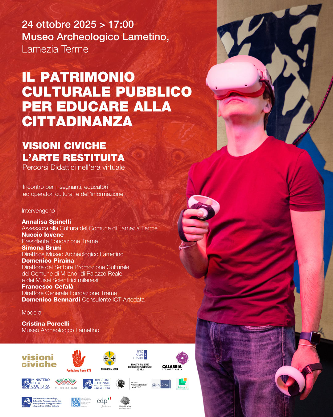 A seguito del successo della mostra “Visioni Civiche L’Arte Restituita. Dalle opere confiscate alle mafie al bene comune”, promossa da Fondazione Trame ETS e Fondazione Cassa Depositi e Prestiti, con la collaborazione dell’Associazione MetaMorfosi e il patrocinio del Ministero dell’Interno, Trame prosegue il percorso destinato alla valorizzazione delle opere restituite con una nuova iniziativa, finanziata da Regione Calabria con risorse PAC 2014/ 2020- Az. 6.8.3, digitale, dedicata principalmente alla formazione civica delle giovani generazioni, intrecciandosi con la nuova offerta educativa permanente che il Museo Archeologico Lametino offre al territorio.