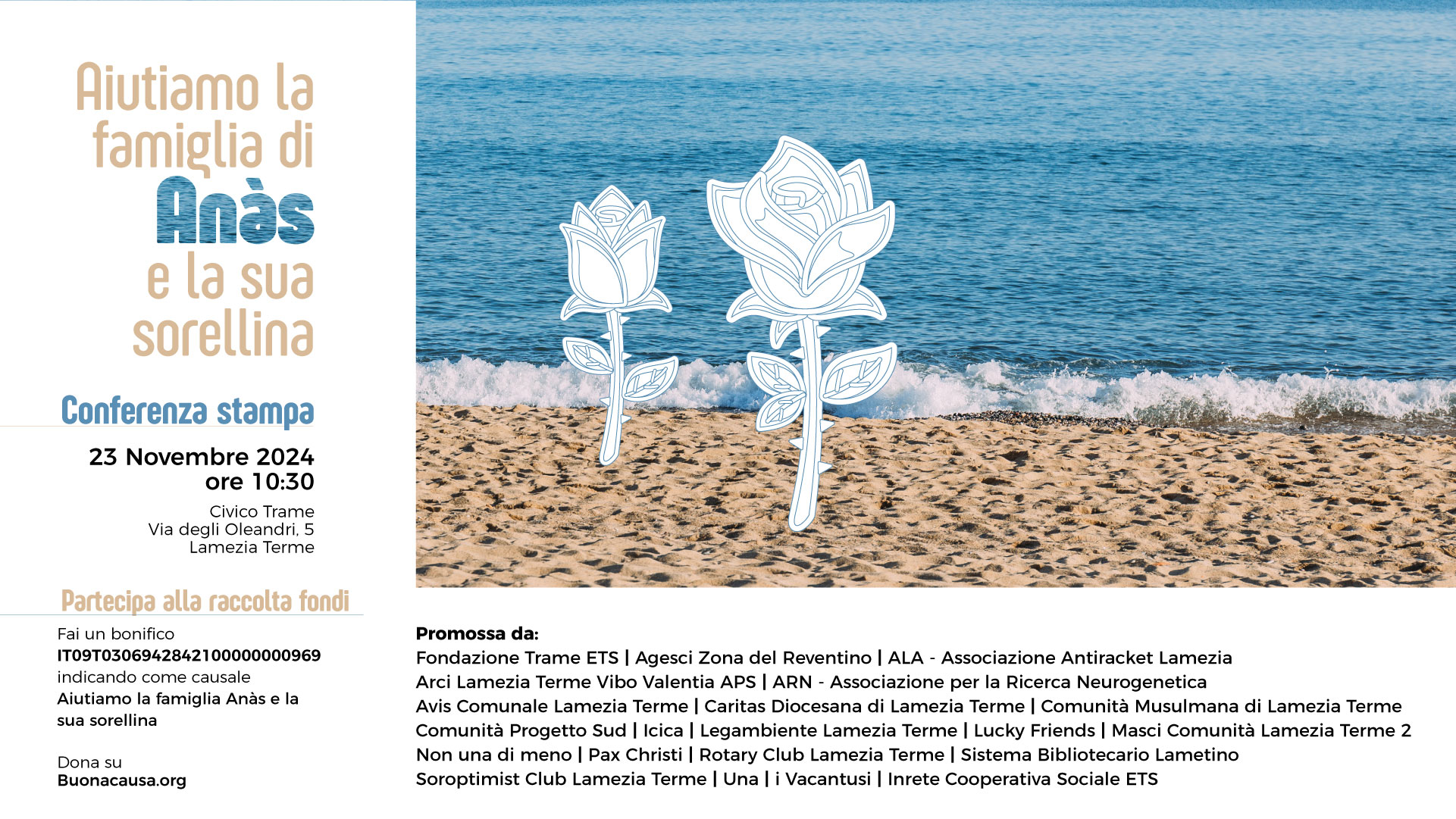 Una rete di associazioni, enti del terzo settore e Istituzioni, composta da Fondazione Trame ETS, Agesci Zona del Reventino, ALA - Associazione Antiracket Lamezia, Arci Lamezia Terme Vibo Valentia APS, ARN - Associazione per la Ricerca Neurogenetica, Avis Comunale Lamezia Terme, Caritas Diocesana di Lamezia Terme, Comunità Musulmana di Lamezia Terme, Comunità Progetto Sud, Icica, Legambiente Lamezia Terme, Lucky Friends, Masci Comunità Lamezia Terme 2, Non una di meno, Pax Christi, Rotary Club Lamezia Terme, Sistema Bibliotecario Lametino, Soroptimist Club Lamezia Terme, Una, i Vacantusi, Inrete Cooperativa Sociale, promuove e sottoscrive una raccolta fondi in ricordo del piccolo Anàs e in aiuto della sorellina Teyssir Zouabi di otto anni che ha vissuto un dramma devastante.