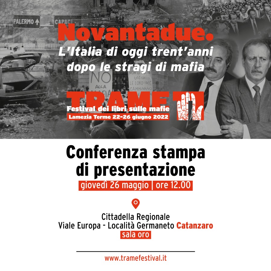 Dal 22 al 26 giugno a Lamezia Terme (Catanzaro) si svolgerà l’undicesima edizione di un evento che ha ormai raggiunto un rilievo nazionale, e vanta anche questa volta un programma ad ampio respiro anche perché cade nel trentennale degli attentati di Palermo: “Novantadue-L’Italia di oggi trent’anni dopo le stragi di mafia” è il titolo di questa edizione.