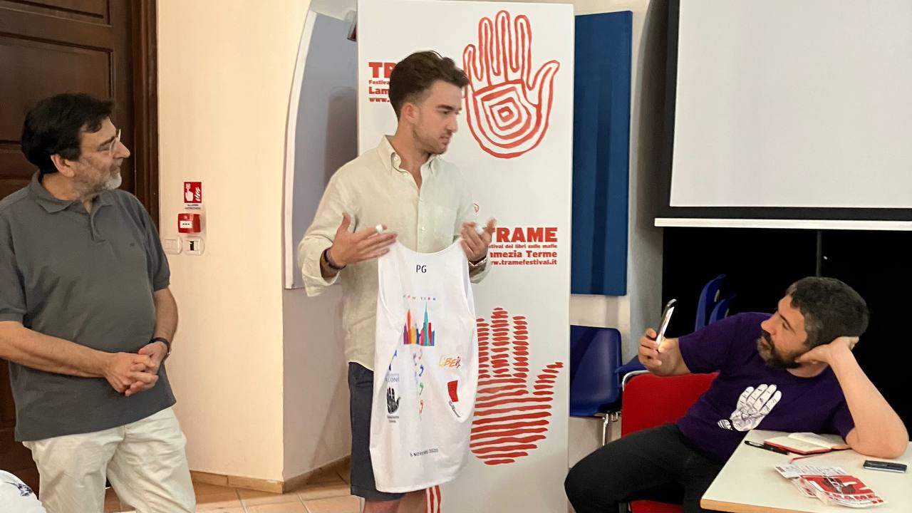 Paolo Giudice ha incontrato i volontari di Trame Festival in occasione di Trame12, raccontando loro com’è nata l’idea di correre la maratona con i simboli della lotta alle mafie e presentando la canotta che indosserà.