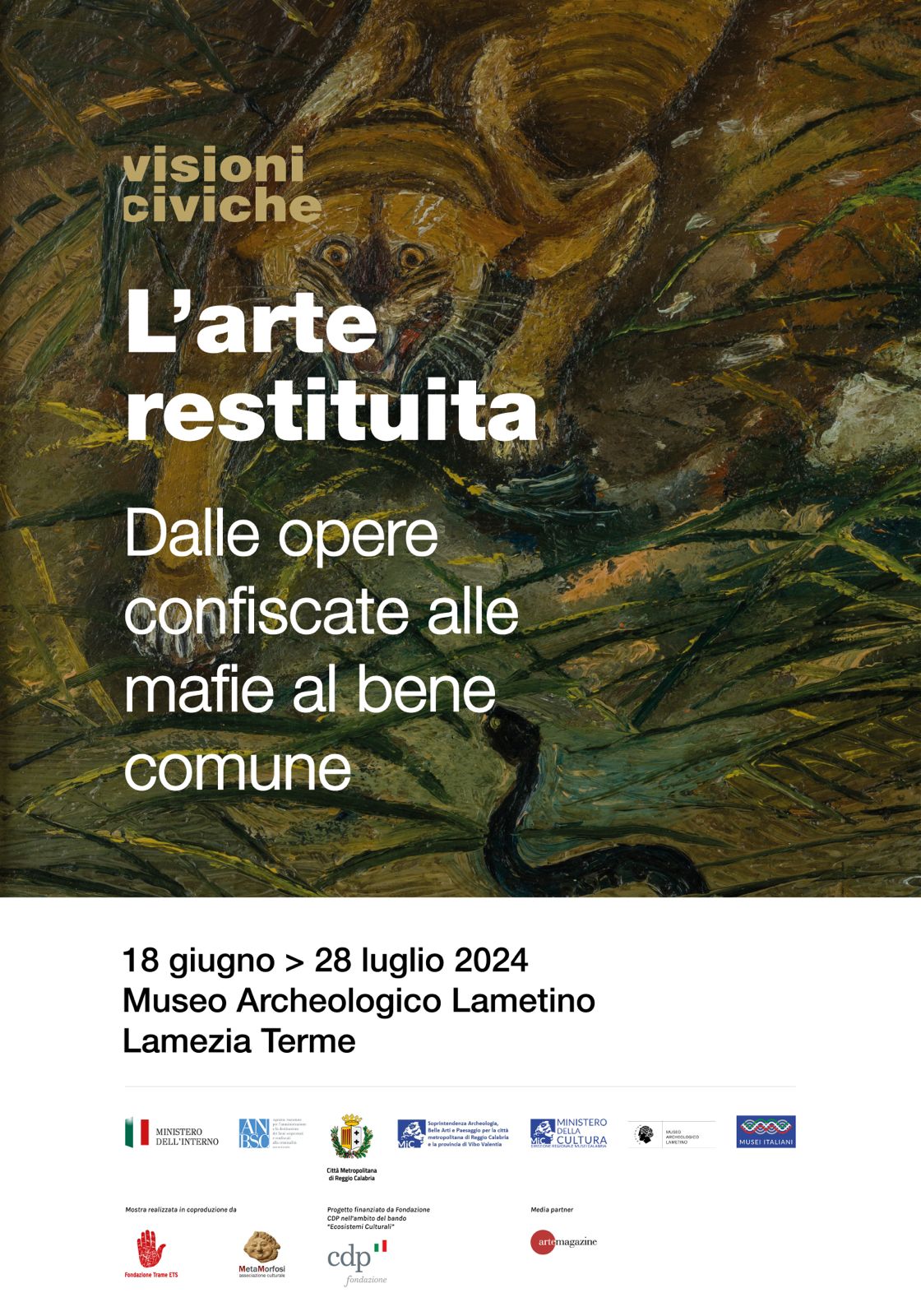 La Fondazione Trame e Associazione MetaMorfosi, con il Patrocinio del Ministero degli Interni ed il sostegno della Fondazione CDP, ente no profit del Gruppo Cassa Depositi e Prestiti nell’ambito della prima edizione del bando Ecosistemi Culturali, presentano Visioni Civiche - L'arte restituita. Dalle opere confiscate alle mafie al bene comune un inedito progetto espositivo curato dal professor Lorenzo Canova che, da 18 giugno al 28 luglio, porterà in mostra nel Complesso Monumentale di San Domenico di Lamezia Terme, sede del Museo Archeologico Lametino, una selezione di opere d’arte sequestrate alla criminalità organizzata. Occasione per la presentazione della mostra, in un simbolico allineamento di temi e obiettivi, è il Festival dei libri sulle mafie Trame, che dal 2011 accoglie ogni anno oltre 10 mila presenze caratterizzandosi come un evento dal forte richiamo culturale sul territorio nazionale.