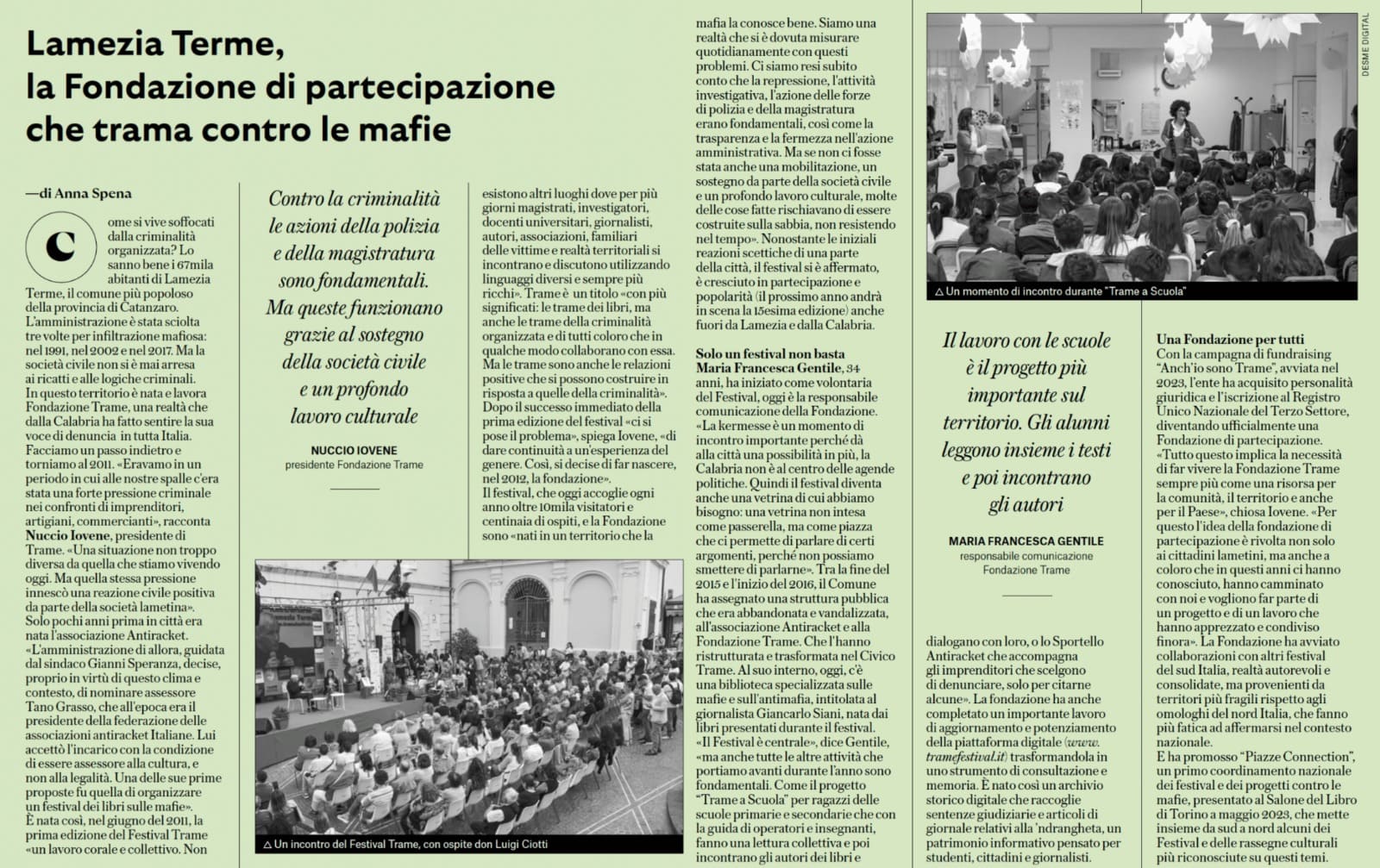 La Fondazione Trame ETS contribuisce a promuovere lo sviluppo di una società democratica basata sulla coscienza civile e sui valori di legalità e diritto, libertà, uguaglianza
