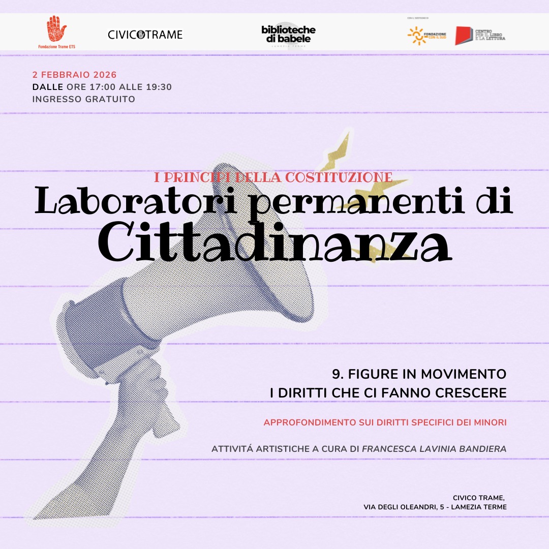 Prosegue il percorso di Biblioteche di Babele a Civico Trame con un nuovo appuntamento in programma lunedì 2 febbraio 2026, dalle 17:00 alle 19:30, presso il centro culturale di via degli Oleandri a Lamezia Terme.