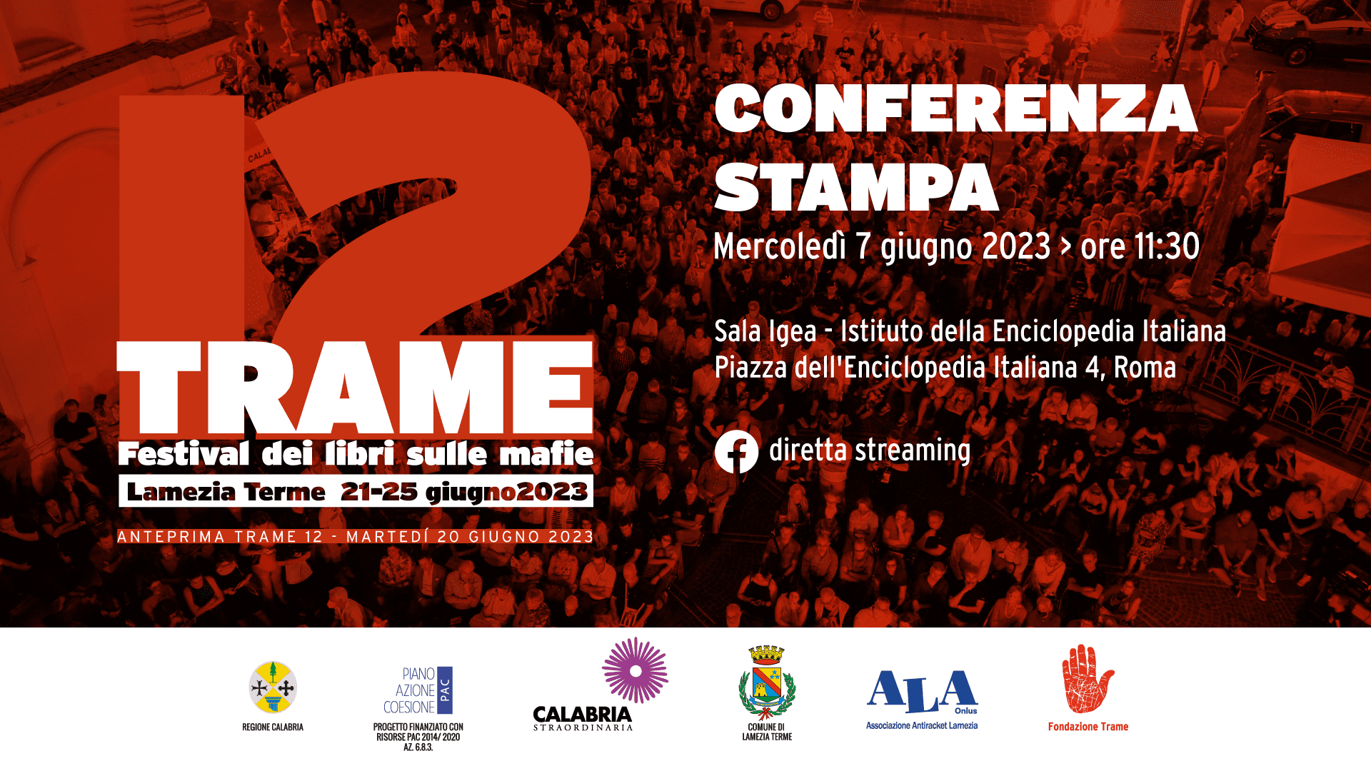 L'evento avrà luogo domani, mercoledì 7 giugno 2023, alle ore 11.30, presso la sede dell'Istituto Enciclopedia Italiana Treccani in Piazza della Enciclopedia Italiana, 4, a Roma. Sarà possibile seguire la conferenza anche in streaming, al seguente link: https://youtube.com/@treccani e sui canali di Trame Festival.